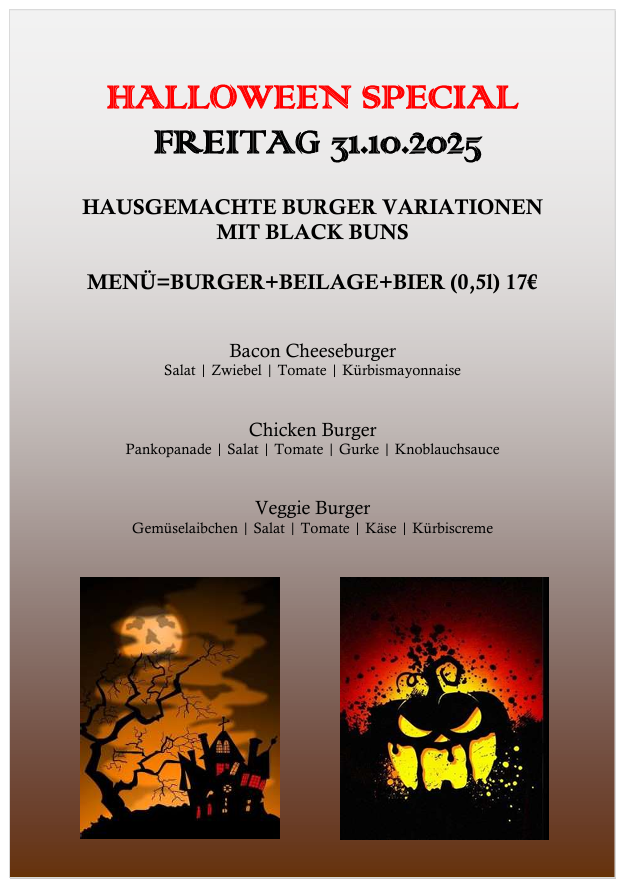 AUSNAHME: Samstag 1.11. gelten unsere Feiertags-Öffnungszeiten, deshalb Freitag 31.10. Burger Abend als Zusatzangebot!